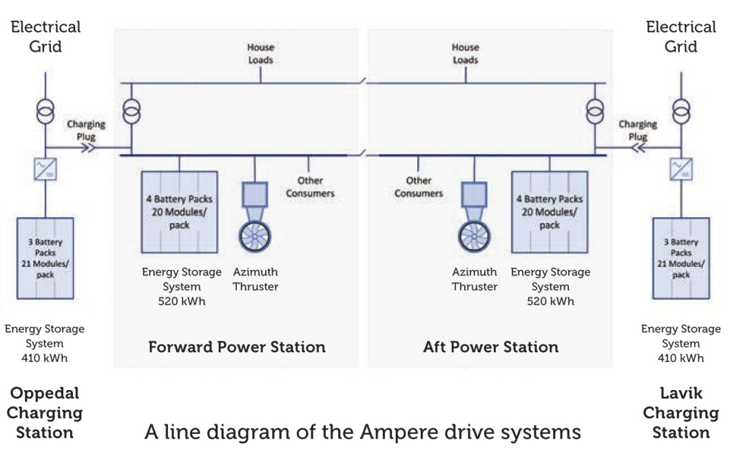 - The ferry can also be equipped with one 175 kW diesel generator that are be used as range extenders when needed. In this case the diesel generator feed the ships 440 Vac grid, and the micro-grid unit is switched to operate as AFE to provide power for the propulsion units.